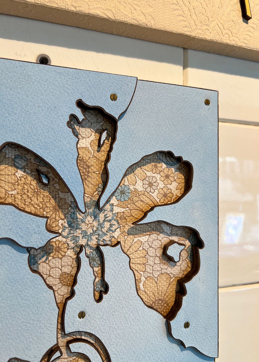 Most of the pieces in the show have a deeper meaning embedded in them: Insieme / Together is a series that brings together silhouettes of flowers collected by my daughter on special occasions, layered over fragments of 100-year-old wallpaper from the home my Italian grandparents built. Capire quasi tutto / Understanding almost everything is a visual representation of how it feels (to me) to live in a foreign country.