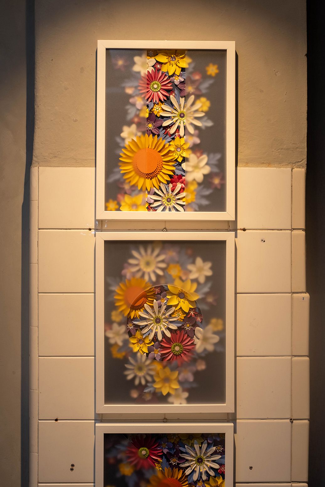 Most of the pieces in the show have a deeper meaning embedded in them: Insieme / Together is a series that brings together silhouettes of flowers collected by my daughter on special occasions, layered over fragments of 100-year-old wallpaper from the home my Italian grandparents built. Capire quasi tutto / Understanding almost everything is a visual representation of how it feels (to me) to live in a foreign country.