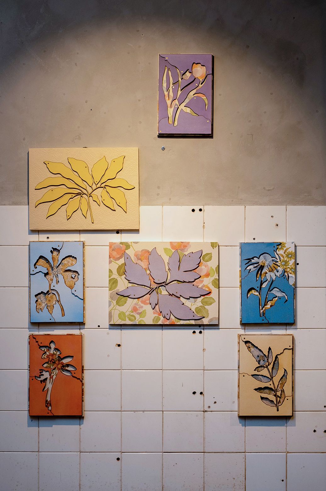 Most of the pieces in the show have a deeper meaning embedded in them: Insieme / Together is a series that brings together silhouettes of flowers collected by my daughter on special occasions, layered over fragments of 100-year-old wallpaper from the home my Italian grandparents built. Capire quasi tutto / Understanding almost everything is a visual representation of how it feels (to me) to live in a foreign country.