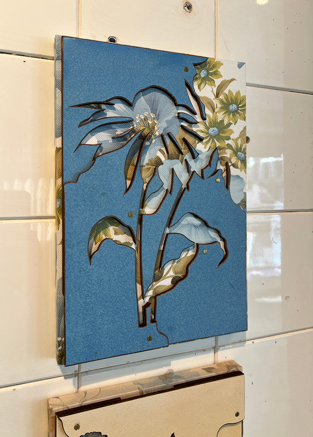 Most of the pieces in the show have a deeper meaning embedded in them: Insieme / Together is a series that brings together silhouettes of flowers collected by my daughter on special occasions, layered over fragments of 100-year-old wallpaper from the home my Italian grandparents built. Capire quasi tutto / Understanding almost everything is a visual representation of how it feels (to me) to live in a foreign country.
