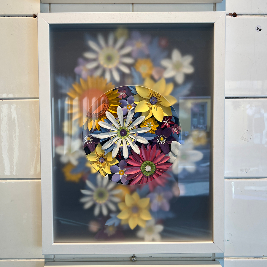 Most of the pieces in the show have a deeper meaning embedded in them: Insieme / Together is a series that brings together silhouettes of flowers collected by my daughter on special occasions, layered over fragments of 100-year-old wallpaper from the home my Italian grandparents built. Capire quasi tutto / Understanding almost everything is a visual representation of how it feels (to me) to live in a foreign country.