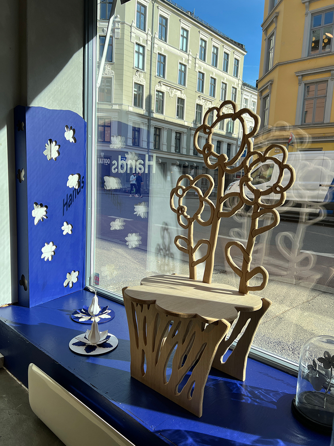 Many of the pieces started out as a playful idea, and then gathered more significance as I worked on them. The ‘flower chair’ for example was supposed to be a simple wooden totem. Thanks to conversations with the talented makers at Fellesverkstedet, it eventually became a take on a chair my father and I built when I was a child, made to match my daughter’s current height.